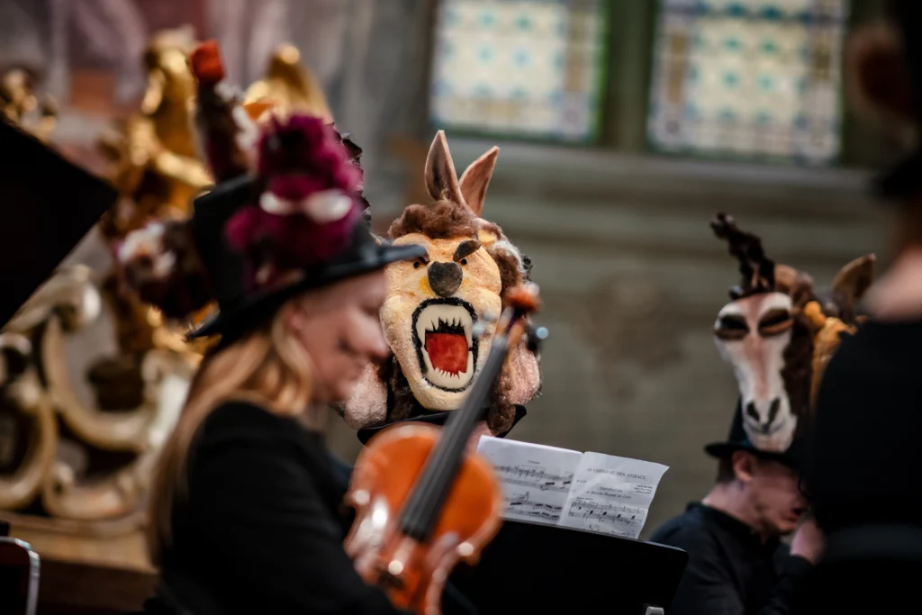 „Karneval zvířat Camilla Saint-Saënse je plný neočekávaných zvratů a překvapení. Příchod krále zvířat naplní sál očekáváním, co bude dál. Kohouta a slepice by nikdo nečekal. Proplujeme také akváriem, proletíme voliérou. Možná vás vyděsí divoký tanec fosilií, ale nakonec se před velkým finále vše uklidní s tancem bílé labutě. Mezi zvířaty se také objeví dva klavíristé. Právem? Nechte se překvapit. Ojedinělé představení s maskami spojí prvky divadla i tance, a především uvede naše mladé posluchače do fantastického světa hudby.“