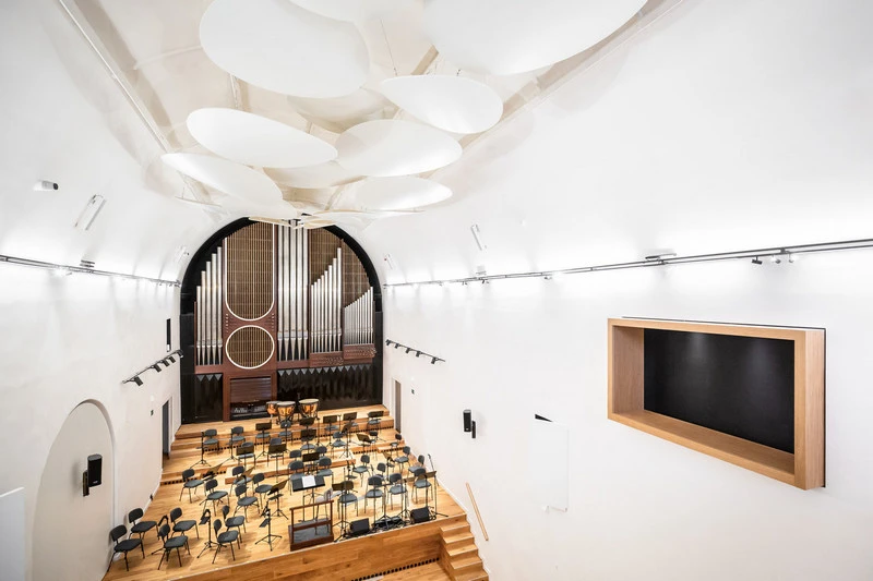 Hlavní myšlenkou rekonstrukce bylo navrátit sálu, který byl navržen jako kostel, jeho původní tvar a jednoduchost. Starý akustický strop, těžkou visutou galerii a boční balkon tak nahradily minimalistické prvky, které citlivě zdůrazňují původní konstrukci sálu kostela. Výraz prostoru nyní udávají jednoduché linie a omezená škála materiálů a barev – dřevo a dále černá s bílou barvou. Nejvýraznějším prvkem interiéru jsou lehké bílé akustické baldachýny zavěšené pod stropem. Pohled na akustické obláčky evokuje nebesa. Nově přidané prvky interiéru jsou dřevěné, původní tvar sálu a akustické panely pod stropem jsou bílé a povrch stěn je modelován pouze vrženými stíny akustických panelů. Všechny dveře a okna jsou natřeny černou barvou, aby vynikaly pouze hlavní linie koncertního sálu.