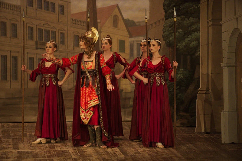 K barokní opeře neodmyslitelně patří také tanec. „Bohužel tato zvláštní inscenace, kde každé jednání psal jiný skladatel, neobsahovala vůbec žádnou typickou taneční hudbu jako takovou,“ říká choreografka Helena Kazárová. „Nicméně každé jednání je uvedeno několikadílnou předehrou. Po dohodě s režisérem jsem tedy využila některé části těchto ouvertur a taneční dění slouží jako lehce alegorický vstup do dalšího jednání. Roztančili jsme i závěrečný sbor, jak bývalo v té době zvykem.“ Tanečníci jsou tedy součástí dramatických scén ve všech aktech.