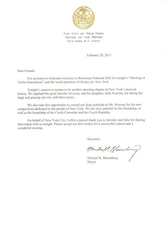 Velké uznání si ze své poslední cesty do New Yorku přivezl houslista Jaroslav Svěcený . V premiéře tam uvedl svou skladbu Strings for New York , kterou dedikoval tomuto městu, kam podle svých slov jezdí hrát nesmírně rád. Při příležitosti uvedení skladby přečetl ředitel zahraničního odboru města NY Carlton Vann dopis starosty města Michaela Bloomberga, jemuž Jaroslav Svěcený věnoval jediný rukopis této skladby na ručním papíře z Velkých Losin. „Tak jsem byl opět jednou hrdý na to, že jsem Čech! “ Uvedl houslista.