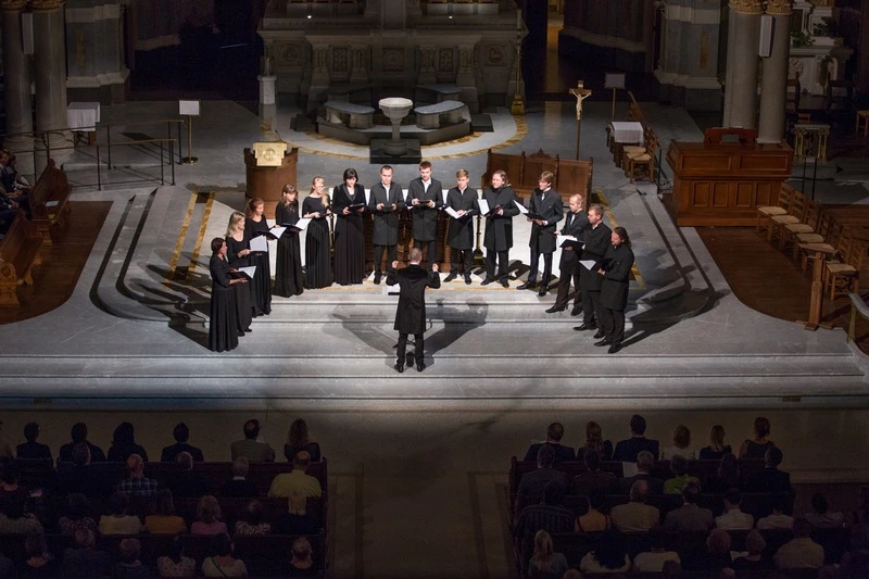 Vrcholem festivalu byl večerní koncert dvou profesionálních ansámblů. Belgický Psallentes jsou vlastně dva ansámbly. Specialista v oboru Hendrik Vanden Abeele nejprve založil mužský soubor a o 7 let později ženský. Mám dojem, že nádherně znějící hlasy sedmi mladých žen, které obohatily festival už předčily ty mužské. Tentokrát byly na programu zpěvy z antifonáře cisterciánského opatství v Salzinnes, jehož pergamenový originál je uložen v kanadském Halifaxu. Vox Clamantis z estonského hlavního města Tallinn je soubor osmi mužských a tří ženských hlasů pod vedením Jaan-Eik Tulve. I on má k dispozici výborný hlasový potenciál, který interpretuje nejen gregoriánský chorál, ale i starou a soudobou hudbu, řada estonských skladatelů, včetně Arvo Pärta, pro Vox Clamantis komponovala. Žalmy jejich krajana z minulého století Cyrilluse Kreeka jsou právě inspirovány gregoriánskými zpěvy.