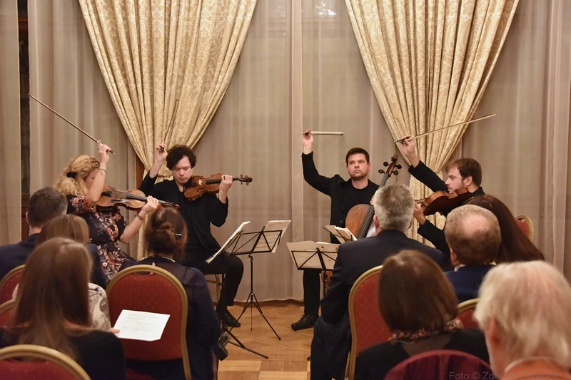 Úvodem zazněl Smyčcový kvartet č. 4 Bély Bartóka. Rozsáhlá, složitá a technicky velmi náročná kompozice jeví se i po jednadevadesáti letech moderněji a nověji než mnohá dnešní díla. Vystihnout a přesvědčivě tlumočit ducha v ní skrytého vyžaduje výjimečné úsilí a pozornost, technickou suverenitu, rozbor a perfektní znalost celé partitury od každého hráče. Bartókova kvarteta miluji, a znám je v provedení a hlavně nahrávkách nejskvělejších souborů. Provedení Haasovců však překonalo moje představy. Zmíním krátce pár poznámek k větám. Allegro – fráze a hlasy jsou neobvykle zřetelně kontrastní, nepozorovaně navazují a plynule kolují mezi jednotlivými hlasy. Prestissimo, con sordino – z ducha věty až mrazí, obdivuhodně plastická struktura dynamiky hlasů. Non troppo, lento – sugestivní hluboký smutek znějící z cellového sóla. Allegretto pizzicato – perfektně odstíněný a vystavěný tvar zvuku pizzicat. Allegro molto – až dravě radostná a vitální, s chutí a vervou prýštící energie. Haasovým kvartetem vytvořený obraz tohoto díla je jeho nejpůsobivější interpretace, kterou jsem kdy poznal. Takže parafrázuji proslulý bonmot slavného violisty Ladislava Černého: Vážení, kdyby vás Bartók slyšel, zvolal by: Tak přesně jsem si to představoval!