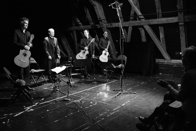 Úvodní skladba Die Sprache ist die Strafe španělského autora Alberta Hortigüely již záhy naznačila zásadní momenty celého vystoupení: důraz na přirozený dozvuk, předávání ozvěn mezi nástroji a prostorové zpracování hudebního materiálu. Forma aktuálního instrumentálního kvartetu přirozeně eliminuje tradiční melodiku, jejíž náhradou je zde distribuce opakovaných tónů mezi hráči navzájem. Dvojice až čtveřice partů staccat či skluzů tvořily v polyrytmické faktuře přesná i mírně obměněná echa, zatímco klouzavé akordy přes všech šest strun hrané se slide válečky oživovaly domovské kontexty tradiční klasické kytary.