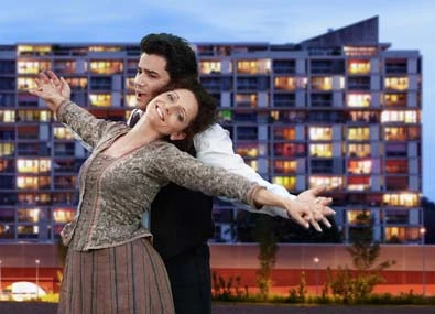 Švýcarská televize Swiss TV navázala na jedinečný live přenos Verdiho Traviaty z Paříže, který byl vysílán také Českou televizí, tentokrát Pucciniho operou Bohéma . V hlavním městě Bernu se letos 29. 9. odehrála v živém přenosu „La Bohème im Hochhaus“ přímo z bytu ve výškové budově, ze zahrady, z malířského ateliéru, prádelny, pizzerie, ale také z autobusové zastávky před domem. Nedaleké nákupní středisko nahradilo Pucciniho původní pouliční trh a nalezl v něm útočiště i velký orchestr se dvěma pěveckými sbory. Umělečtí tvůrci zde zvolili zvláštní propojení moderních interiérů a exteriérů s historickými kostýmy účinkujících, evokujícími dobu vzniku opery. Obraz byl přenášen v plném rozlišení HDTV a reálný zvuk zajišťoval nejmodernější systém Sennheiser bezdrátových mikrofonů a zpětných odposlechů. Hlavní sólisté – Mimi ztvárnila Maya Boog , Rodolfa Saimir Pirgu , Musettu Eva Liebau a Marcella Robin Adams – i všichni ostatní účinkující včetně dvou pěveckých sborů byli vybaveni celkem 142 miniaturními mikrofony MKE 1 a MKE 2 s kapesními vysílači SK 5212. Čas nezbytný pro přesun pěvců či úpravu scény vyplňovali mluveným slovem (opět live) tři průvodci operou s mikroporty SKM 5200.