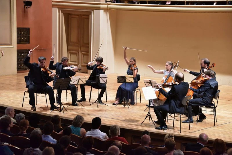 Na festivalovém večeru v Dvořákově síni Rudolfina se 29. května propojilo několik skvělých prvků komorní hudby v jednu výjimečnou hudební událost. Dva soubory, české Wihanovo kvarteto (Leoš Čepický, Jan Schulmeister, Jakub Čepický, Matěj Štěpánek) a britský Sacconi Quartett (Ben Hancox, Hannah Dawson, Robin Ashwell, Cara Berridge) se prolnuli v jedno dokonalé smyčcové okteto, aby představili tři geniální skladatele v dílech jejich raného tvůrčího období. Ač oba soubory dělí rozdíl i zkušenost jedné generace, podoba jejich hudebnosti, nástrojová suverenita i příbuzný temperament komorního projevu z nich na pódiu vytvořily sourozence. Mladší Sacconi Quartet (zal. 2001) sklízí obdiv a ocenění svým již vyzrálým projevem, a starší Wihanovci svým stále mladistvým elánem. Wihanovo kvarteto je již několik desetiletí vnímáno jako špičkový soubor světové úrovně. Nedávné odchody jeho dvou členů, nejprve violisty Jiřího Žigmunda a nyní i cellisty Aleše Kaspříka, mohly představovat velké ohrožení kompaktnosti i úrovně kvarteta. Poslední výkony včetně tohoto však dokazují, že tomu tak není a zřejmě i nebude. Slibný houslista Jakub Čepický se překvapivě rychle adaptoval ve skvělého violistu, který do kvartetních partů violy přispívá i obohacujícími „houslovými“ prvky (velkou škálou způsobů vibrata, trylku, technickou zručností ap). Po relativně krátké době tak působí jako přirozená součást souboru. Připomíná mi fenomén Milana Škampy od Smetanovců. Svými fyzickými dispozicemi je viole zjevně předurčen, mohl by si troufnout i na největší violovou menzuru. U cellového partu jsem očekával alternaci zkušeným a pohotovým Michalem Kaňkou, ale výkon Matěje Štěpánka z absolventského ročníku HAMU (prof. M. Petráš) ukázal i překvapivě slibnou možnost případného řešení definitivního obsazení. Štěpánkův projev byl po všech stránkách suverénní a hudebním temperamentem se mi jevil ještě zajímavějším než bezesporu výborná Cara Berridge. Oba soubory mají velké štěstí na ideální sekundisty, kteří jsou nástrojově srovnatelní se svými primárii. Hannah Dawson i Jan Schulmeister nebyli vzájemně rozeznatelní (na pohled je však Hannah mnohem hezčí). Ben Hancox je houslista podobného založení jako Čepický, což bylo slyšet především v Šostakovičově oktetu. Leoše Čepického pokládám za jednoho z našich nejzajímavějších houslistů se sugestivním hudebním temperamentem a výjimečným citem pro ducha hraného díla.