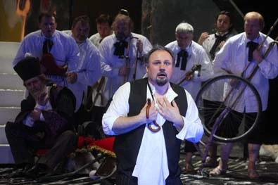 Zajímavým předvečerem zahájení festivalu byla Janáčkova Věc Makropulos , přivezená z Moskvy v podání alternativního souboru Helikon-Opera , kterou založil režisér Dmitrij Bertman roku 1990, a která už nastudovala víc než padesát oper. Scénografie Věci Makropulos (autor v programu neuveden) je vytvořena z téhož materiálu, z jakého je onen osudný recept na dlouhověkost od alchymisty z doby císaře Rudolfa II., tedy z papíru. Na půlkruhovém zavěšeném horizontu vidíme prostřižené obrysy historických postav a na začátku inscenace z něj na nás vykukuje odporně ošklivá stařena, kterou až postupem děje najdeme ve službách Eliny Makropulos jako její komornou. Za horizontem zpočátku spíše tušíme záhadné poloprůhledné bílé postavy, jakýsi stálý chór, oblečený do historických kostýmů od doby Rudolfa II. až po dobu Čapkovu a Janáčkovu. Elina Makropulos vstupuje na jeviště nenápadně ve vcelku nepříliš luxusních šatech, jako by o módu příliš nedbala. Kristýnka je tu naopak elegantní a dosti studenou kariéristickou mladou dámou. Ve druhém dějství přichází Elina v kostýmu královny Alžběty anglické, soupeřky Marie Stuartovny a tedy zároveň v kostýmu doby rudolfinské. Poklízečka se Strojníkem – oba starší a korpulentnější – touží (jako několik zúčastněných postav) silně po sexu a nijak se tím netají. V závěrečném jednání opery konečně ti historičtí „duchové“ sejdou dolů na jeviště k Elině, aby ji přivítali mezi sebe. Krista vše ukončí tím, že osudný recept spálí. Od něj ovšem vzplane vše a „komedie“ končí. Představitelka EM Natalija Zagorinskaja čněla nade všemi ostatními sólisty jednolitostí svého pěveckého i hereckého výkonu. V jejím stínu zůstávali i kvalitní představitelé dr. Kolenatého, solicitátora Vítka nebo mladého Gregora. Prusův syn Janek je pojat jako opravdový hlupák, bytost opožděná ve vývoji – tím však jeho sebevražda poněkud ztrácí na své působivosti. Z orchestru zněl pod dosti necitlivým vedením dirigenta Vladimira Ponkina tvrdý Janáček, postrádající nuance, ať už jakéhokoli druhu. (Stejně zajímavé jako inscenace jsou mimochodem i osudy moskevské Helikon-Opery, o nichž si můžeme přečíst na jejích webových stránkách. Rekonstrukce budovy, v níž sídlí a probíhala již několik let, byla zastavena po odchodu dlouholetého moskevského starosty Lužkova. Co bude dál, nikdo neví tím spíš, že budova je v centru Moskvy na atraktivním místě, o které projevují zájem mnozí, kteří rozhodně netouží po tom, aby zde bylo divadlo.