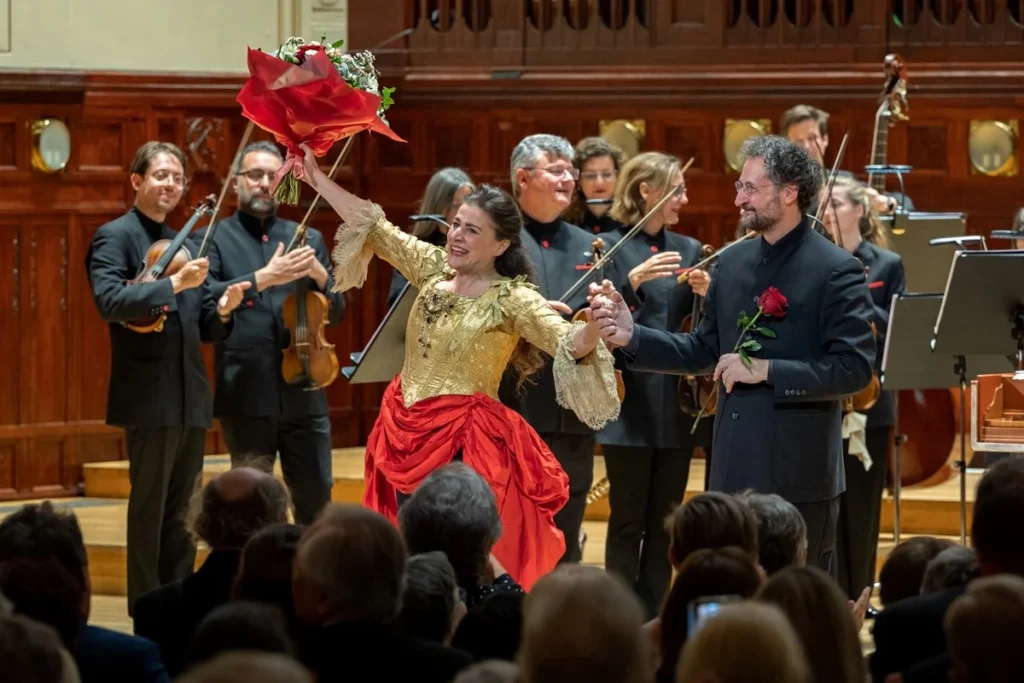 Cecilia Bartoli není jen operní zpěvačka, při svém temperamentu zvládá zároveň i manažerské posty, od roku 2012 je uměleckou ředitelkou Svatodušního festivalu v Salcburku a od počátku ledna ředitelkou Opéra de Monte Carlo. V roce 2016 iniciovala vznik orchestru barokních nástrojů Les Musiciens de Prince-Monaco, s nímž do Prahy přijela, a který je v její Opéra de Monte Carlo rezidenčním orchestrem. Vede jej od roku 2019 jako šéfdirigent Gianluca Capuano. Jede-li Cecilia Bartoli koncertovat s doprovodným orchestrem, aby připomněla velkého barokního kastráta Farinelliho (Farinelli a jeho současníci), pak neváhá ani chvíli a ke svému zpěvu připojí i herecké etudy na téma hostující hudební společnosti. Na pódiu je připraven cestovní kontejner, z něhož jakýsi dejme tomu komorník, garderobiér, obratně postaví pro pěvkyni minišatnu s líčícím stolkem a je připraven ji oddaně obsluhovat, starat se o ni. Orchestr má s sebou výrazné instrumentální osobnosti, které jsou nadány také schopností improvizace a všem nechybí smysl pro humor. Cecilia Bartoli se postupně rozezpívává, dokonce bych si dovolila říct, že celý večer vrcholí až závěrečným přídavkem, v němž je v bohatých koloraturách Farinellimu nejblíže. Nejen co do bohatých melismat, ale také v podobě barokně bohatého zlatého kostýmu s ostře červenými pštrosími pery. Od jednotlivého čísla k dalšímu postupuje Bartoli s přestávkami, které jsou naplněny převleky, hraným odpočinkem i vtipnou interakcí s garderobiérem, který zjevně ovládá dobový tanec a „donutí“ pěvkyni, aby vystřihla krátký temperamentní taneček.