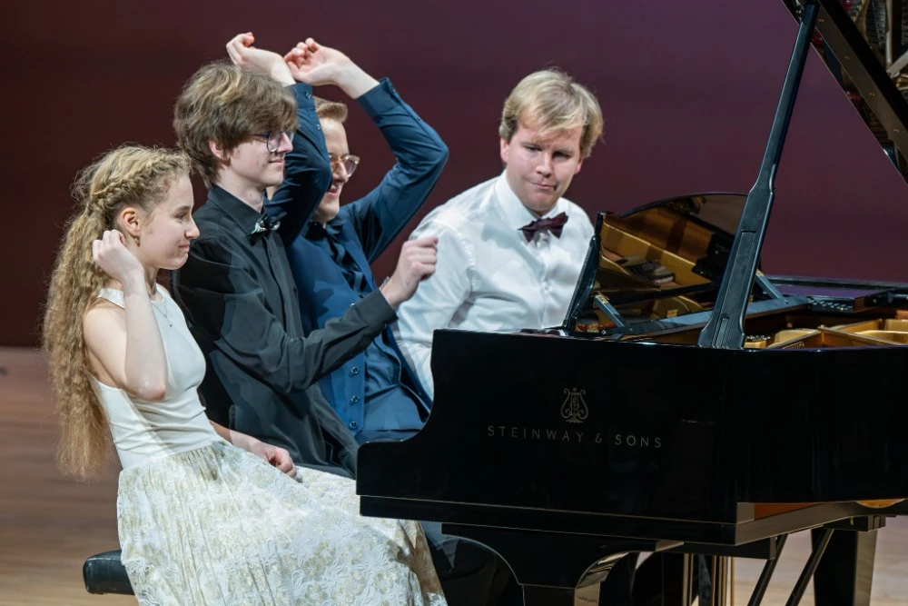 Na závěr večera si mladí klavíristé připravili překvapení: všichni čtyři společně usedli na dvě (!) klavírní židličky a rozesmáli posluchače Galop-Marchem pro jeden klavír a osm rukou od francouzského skladatele Alberta Lavignaca.