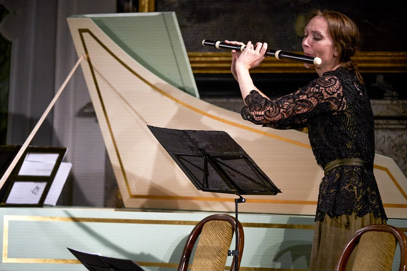 Druhá polovina večera přinesla dvě Couperinova díla a soubor se rozrostl o druhý part flauty traversy, který citlivě přednášela Martina Bernášková. O první skladbě jsem se již zmínila v souvislosti s interpretací cembalisty Ericha Traxlera. Druhá s titulem Concert instrumental sous le titre l‘ Apothéose composé à la mémoire immortelle de l‘ incomparable Monsieur de Lully (Instrumentální koncert nazvaný Apoteóza, složený k nesmrtelné památce nedostižitelného pana de Lully) je triová sonáta. Autor v ní propojuje francouzský kompoziční styl s italským. Názvy jednotlivých částí půvabně (a s barokní gestikou) uváděla Jana Semerádová. Posluchači si tak mohli společně projít cestu Lullyho od Elysejských polí až na Parnas, vrchol zasvěcený Apollonovi a Múzám a slyšet rozdíly mezi stylem Lullyho a Corelliho, který Couperin vykreslil. Na Parnasu nakonec zavládl mír, byť s podmínkou: „…dle námitek francouzským múz – že jakmile se bude mluvit jejich jazykem, bude se od nynějška říkat Sonáda a Kantáda, po vzoru balada či serenáda.“