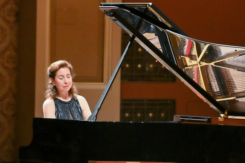 Po přestávce zahrála umělkyně nejprve Bachovu Anglickou suitu F dur BWV 809. Úvodní preludium a následujících pět barokních tanců znělo v pianistčině podání tak něžně a snově, že jsem si připadal, jako bych vstupoval do obrazů Watteauových. Jen v závěrečné gigue bylo toho snění trochu méně – v brilantních a vtipných klavíristčiných nonlegatech jsem slyšel spíš cválat koně a vytrubovat fanfáry.