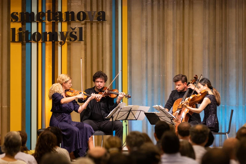 Úvodem koncertu zazněl Smyčcový kvartet č. 2 d-moll Bedřicha Smetany, kompozice jako by psaná na tělo Pavel Haas Quartet. Když jsem před lety recenzoval jeho studiovou nahrávku Smetanových kvartetů, musel jsem se s dravým přístupem kvartetistů ke skladatelovým kompozicím smiřovat, zvláště v případě kvartetu Z mého života. Motivická koncentrovanost, tektonická zkratka a vypjatá emocionalita tohoto Smetanova díla, které tak učarovalo Arnoldu Schoenbergovi, jsou však ideálním plátnem k projekci dravě kontrastních interpretačních představ souboru. Jediným limitem v excentrickém podání vnitřně rozervaného Smetanova opus byly akustické dispozice litomyšlské jízdárny, v níž znějí smyčcové soubory výrazně dutě a zdaleka ne tak příjemně jako nástroje klávesové. Zatímco Smetanovu kvartetu d-moll vládla exprese, po níž bylo nutno přeladit, Dvořákův Americký smyčcový kvartet F-dur op. 96 dostal v podání Haasovců rysy hluboce promyšleného díla, na hony vzdáleného ustálené interpretační tradici akcentující haydnovsky čitelné a obsahově nekonfliktní rysy díla. Zvláště v první větě soubor kouzlil s extrémní dynamikou a razantními tempovými proměnami. Respekt k autorovu zápisu včetně repetice ve vstupní větě a velkorysé nakládání s časem v prvních dvou větách kvartet sice ochudily o pel určité spontaneity a zdánlivě naivní samozřejmosti Dvořákových amerických skladeb z letního pobytu ve Spillville, posluchačskou pozornost však obrátily k důkladnému promyšlení a prožití každé fráze, a to nejen v pomalé větě.