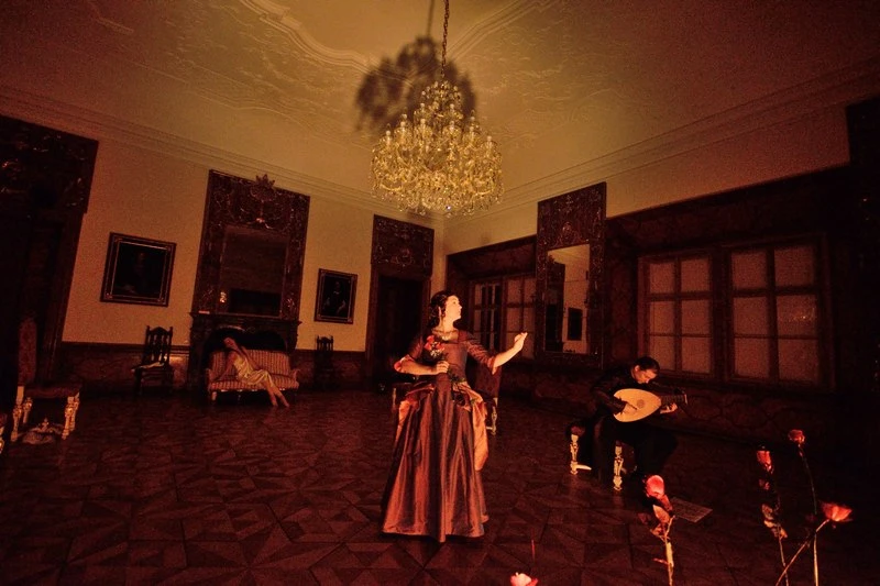 Proměna Eliny Makropulos je ovšem pevně spjata s hudbou, která její život provází i charakterizuje jeho jednotlivá období. V úvodu zazní do zcela temného sálu jen krátké Canto meditativo české skladatelky Ivany Loudové, která nás bohužel opustila v loňském roce. Šepoty, polohlasné výkřiky nebo jen hlesnutí či povzdechy pomaličku uvádí posluchače do děje ve zvolna se rozsvěcujícím nádherném sále. Mládí Eliny Makropulos provází nejprve hudba Johna Dowlanda, vynikajícího anglického loutnisty a vrstevníka Shakespearova, kde se k hlasu přidává precizní loutna Jana Čižmáře a ze šera vystupuje třetí postava Duše E.M., jež tancem provází zpívaný děj. Tanečnice a choreografka Lenka Kniha Bartůňková představuje Duši prostě v nenápadném bílém odění a pohybem, propracovaným a někdy až vysoce expresivním, provází Elinu Makropulos prakticky stále