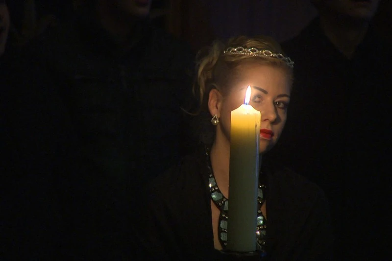 Dvanáctičlenný komorní sbor pod vedením Lenky Dohnalové-Mlynářové nastoupil na scénu efektním způsobem: zpěváci byli nejprve v civilu rozsazeni v předních řadách, v jeden moment se všichni zvedli a nastoupili na první sborové číslo. Sboristé byli zároveň skutečnou „třetí“ hereckou postavou a disponovali i největší pohybovou akcí oproti spíše statickým hlavním postavám. Navíc průběžně putovali prostorem kostela a starali se tak o zajímavé zvukové proměny, především v momentech, kdy stáli a zpívali za lavicemi s publikem. O pěveckých kvalitách pak přesvědčili především v závěru, kdy si poradili s náročnou intonací oscilující na dvou tónech.