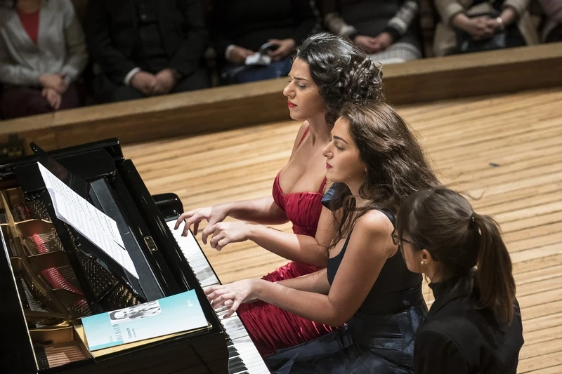 Khatia Buniatishvili se na Klavírní festival Rudolfa Firkušného vrátila po dvou letech, avšak do Česka ji mezi tím zavedlo také loňské provedení Schumannova Klavírního koncertu a moll s Českou filharmonií, s níž natočila své poslední CD obsahující druhý a třetí klavírní koncert Sergeje Rachmaninova (dirigent Paavo Järvi). V případě závěrečného koncertu letošního ročníku (28. 11.) Khatia nechala auditorium nahlédnout také do klavírního umění své sestry Gvantsy. Dámy utvořily duo, jež v kombinaci s posluchačsky velmi atraktivním repertoárem zajistilo velkolepé finále celého festivalu. Gvantsa Buniatishvili nemá tak blyštivou mediální kariéru, což ovšem vůbec neznamená, že bychom ji měli považovat za pouhý stín její o rok mladší sestry. Gvantsa je skvělá pianistka, nicméně Khatiin diář je naplněn koncerty po celém světě tak hustě, že v tomto ohledu ji Gvantsa dostihne opravdu jen stěží. A nalijeme-li si ještě čistšího vína, i na koncertu tohoto večera absorbovala většinu mé pozornosti nevšední osobnost známější Khatii. To je dáno nejen jejími dosavadními profesními úspěchy, ale jednoduše také jejím pohybově výraznějším interpretačním prožitkem. Gvantsa je v tomto ohledu mnohem nenápadnější, a ačkoliv je po technické stránce Khatie důstojným partnerem, její hra je decentnější a v gestech mnohem umírněnější.