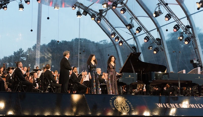 Poprvé v zámeckém parku vystoupil za dirigentským pultem Maestro Semjon Byčkov, ruský dirigent, jenž z politických důvodů ve dvaadvaceti letech emigroval do Spojených států amerických a proslavil se v zahraničí, dirigoval i v Metropolitní opeře New York nebo v Královské opeře Covent Garden v Londýně. Obohacením pohledu na jeho profesní umění a soukromí bylo pro publikum hostování Byčkovovy manželky. Francouzská klavíristka Marielle Labèque přijala pozvání do Vídně i se svou sestrou. O dva roky starší Katia Labèque hraje po jejím boku od dětství a především v letech 1970 – 1997 nahrály řadu společných CD pro prestižní labely Decca, EMI, Philips a Sony. Obě inklinovaly především k vážné hudbě, ale do svého repertoáru zahrnuly i díla z jiných hudebních žánrů, zejména flamenco, jazz, pop a experimentální rock. Schönbrunnské publikum sledovalo koncert i díky postranním velkoformátovým projekcím snímajících koncert. Areál byl vybaven velmi kvalitním zvukovým zázemím, jež svým speciálním vybavením tlumí přírodní zvuky a povětrnostní vlivy. Pořadatelé a organizátoři tak nabídli posluchačům komfort na vysoké úrovni.