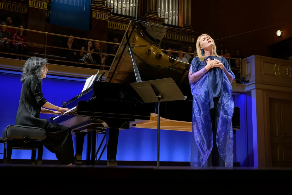 Samostatnou kapitolou je pak její relativně intenzivní zájem o francouzskou písňovou literaturu, Debussyho, Ravela, Faurého, Duparca. Ukázku z této linie její tvorby, ukázku vybranou s vytříbeným vkusem i rozmyslem, jsme mohli na PJ vyslechnout právě letos. Její přístup ke francouzské písňové literatuře, v komorní spolupráci s Mitsuko Uchidou, s léty zajisté dobře vyzrál, a i tohoto nedělního večera nám obě umělkyně složily vrcholný počet z toho, čeho v tomto oboru dosáhly. Přesto si nemohu pomoci: mám z toho večera podobný pocit, jako když Magdalena Kožená zpívá Cole Portera. Není to vůbec špatné, dokonce to v mnoha ohledech budí velký respekt, např. pečlivostí, precizností nastudování, neumdlévající pozorností k poetickému obsahu, slušnou, neurážející výslovností – opravdu těžko formulovat nějaké zásadnější výhrady, když je všechno správně, tak, jak má být. Tady je však situace ještě o to složitější, že je zde nezanedbatelná tradice, o Debussyho písně projevovaly živý zájem velcí pěvci minulosti, Gérard Souzay, abych jmenoval toho nejvýznamnějšího, a zejména pěvkyně jako Victoria de los Angeles, Régine Crespin, Elly Ameling, Frederica von Stade. A to je srovnání, pro kohokoliv, opravdu tvrdé. I dnes je tu velká konkurence: Nathalie Stutzman, Susan Graham, Renée Fleming, Anne Sofie von Otter, Véronique Gens, Sabine Devieilhe, a přidám i svůj soukromý tip, Dawn Upshaw. Jistěže jsem právě předvedl výron čirého subjektivismu, ten seznam by si možná leckterý kritik sestavil po svém a dost odlišně. Ostatně nikterak netvrdím, že se do této řady Magdalena Kožená důstojně nezařadí. Bude však, alespoň pro mne, představovat onen racionální pól ze spektra všech možných přístupů. Což je jen konstatování.