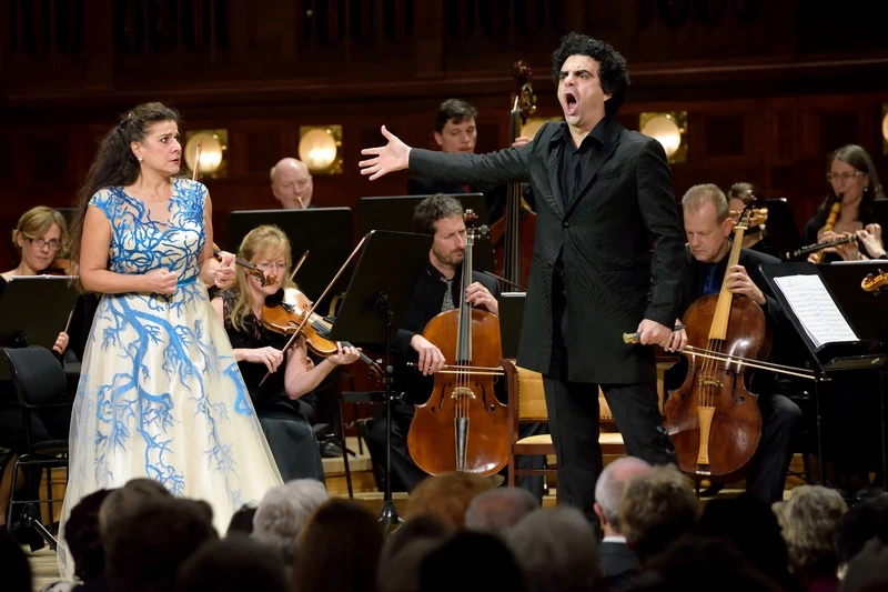 Cecilia Bartoli – Rolando Villazón. Hvězdné spojení na mediální úrovni někdejšího páru snů Angela Gheorghiu – Roberto Alagna. Není divu, že Smetanova síň byla vyprodaná, publikum patřičně nabuzené a mediálně připravené na dvě „superstar“. Na programu byla hudba Mozarta, Rossiniho, Donizettiho a Belliniho, kombinace osvědčených hitů a málo známého. Ono málo známé naštěstí nebylo symbolickou Popelkou, i když i na tu došlo. Nejdřív ale pár vět k instrumentální linii večera. Pěvci přivezli do Prahy i „svůj“ Orchestra La Scintilla. Stojící energická houslistka Ada Pesch jej má tak dobře „secvičený“, že jsem měl pocit, že hraje sám. Bylo to „švýcarsky“ přesné, technicky téměř bezchybné a tónově velmi dobré. Vyjevil se však problém orchestrů, které kombinují moderní smyčce, struníky apod. s replikami dobového dechového instrumentária apod. Prostě se může občas stát, že něco neladí nebo selže, což se párkrát stalo i tento večer. Ouvertury z oper Così fan tutte (Mozart), Popelka, Hedvábný žebřík (Rossini) byly skvěle zahrané. V kompozičně eklektickém, melodicky příjemném Hobojovém koncertu Es dur Vincenza Belliniho se představil na dobovou repliku Pier Luigi Fabretti. Bylo to pěkné, ale nutně jsem si vzpomněl na virtuozitu a tónovou lahodnost hry našich nejlepších hobojistů…