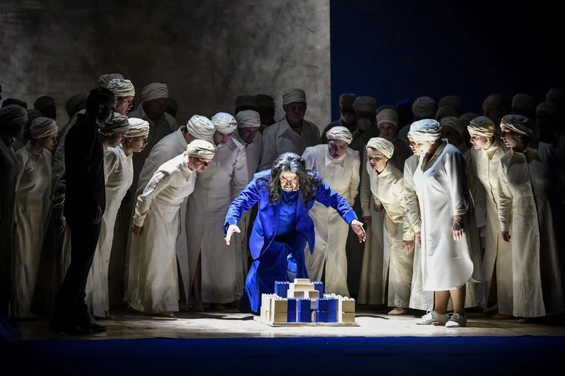 Režisérův náhled na Nabucca je svérázný, jak ostatně bývá jeho zvykem. Jako by ten starý příběh vnímal pomocí mysli jeho hlavního hrdiny. To, co je pro něj, pro Nabucca, důležité, je zdůrazněno, některé momenty jsou potlačeny. Postavy jsou téměř důsledně oblečeny do kostýmů jednotného typu – základem je jakýsi „pracovní plášť“ superjednoduchého střihu – dokonce má tuto podobu i Nabuccův královský tmavomodrý kabát se zlatým límcem. Střihově se odlišuje především kostým bojovné Abigail, která je spolu s Baalovým veleknězem v černém a také bílé kostýmy Zachariáše a Ismaela. Všem postavám chybí jakékoli šperky, dokonce je pominuta i Nabuccova královská koruna, o niž tak cíleně usiluje Abigail. Tuto absenci lze možná vysvětlit jako důkaz, že se díváme na Nabucca opravdu jeho vlastníma očima, protože pro něj může být královská koruna jednou z nepodstatných rekvizit, pouhou součástí jeho „pracovního“ odění. Nemohu však tvrdit, že bych tento symbol na jevišti nepostrádala. Je-li přítomna zlatá archa úmluvy, zlaté vězení pro Nabucca ve formě obřího prstenu pohybujícího se vertikálně na tahu, jsou-li přítomny posvátné nádoby pro oheň nebo písek, je jasně patrné, že rekvizity a scénické doplňky mají v této obřadné inscenaci své nezastupitelné místo…