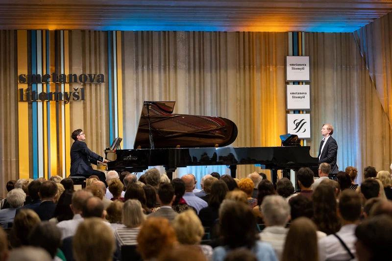Skladatelova autorská úprava rozhodně není nějakým klavírním výtahem či kompoziční zkratkou, právě naopak. Pro znalce Smetanova opus ultimum, jichž bylo mezi festivalovým publikem v litomyšlské Jízdárně nepočítaně, je naopak dobrodružstvím sledovat Smetanovu adaptaci orchestrálního díla do suverénního uměleckého tvaru ve zvukových a nástrojových omezeních či přednostech dvou klavírů. Ano, dvou klavírů, protože pánové Kahánek a Sekera raději usedli ke dvěma klavírům, než aby riskovali ortopedicky choulostivé měření mužských ramen u jednoho nástroje. Zvukově tak Smetanův cyklus spíše vycházel vstříc symfonickým ambicím plného orchestrálního zvuku než komorně delikátnímu zvuku domácího muzicírování před zasvěceným publikem. Dynamicky vrcholná místa jednotlivých básní si rozhodně nezadala s původní orchestrální verzí (Šárka, Tábor, Blaník). Sympatickým gestem interpretační kolegiality bylo střídání obou interpretů při provedení hlavního a doprovodného hlasu, a to při zachování attacca přechodu mezi Táborem a Blaníkem. Právě v těchto symfonických básních vycenila Smetanova klavírní verze na publikum zuby, ostré jako při mnoha orchestrálních nastudováních, v nichž v závěru celého cyklu nejednomu přednímu symfonickému tělesu docházejí fyzické síly. Pětasedmdesát minut čtyřruční hry bez posluchačské přestávky je totiž heroický výkon! Publikum jej ocenilo frenetickým potleskem, zadržovaným nejpozději od Šárky.