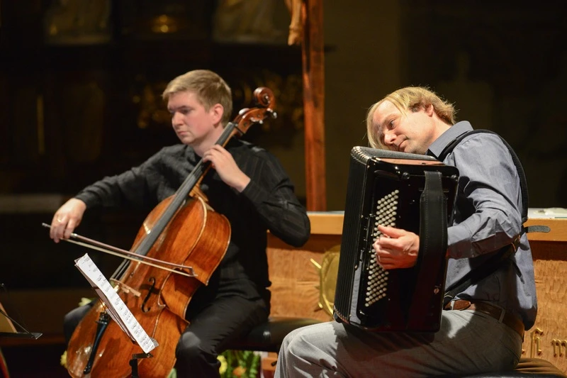 Oba mladí umělci jsou uznávanými vrcholnými interprety, spojení jejich nástrojů je však v koncertních programech spíše výjimkou. Prostor chrámu nejprve zaplnily tóny Suity G dur pro sólové violoncello (Prélude – Allemande – Courante – Sarabande – Menuet I – Menuet II – Gigue) Johanna Sebastiana Bacha. Tomáš Jamník je z těch interpretů, kteří umí velmi úspěšně a přesvědčivě vyjádřit ducha a originalitu zápisu skladatele bez vlastních nadbytečných originalit a zkreslujících vylepšení. Jeho Bach je vzdušně a přirozeně plynoucí tok průzračně čisté hudby. Akustika kostela sice přidala tónům volných vět magickou podobu, ale detaily rychlých částí se jejím vlivem příliš slévaly v jeden zvukový efekt, což u tak dokonalého provedení je přece jen škoda. Intermezzo pro violoncello a akordeon v Německu působícího jihokorejského skladatele Isang Yuna (1917-1995) je skladba se zřetelnými vlivy korejské melodiky i Nové hudby, se složitě prokomponovanou a nesnadnou partiturou. V rukou těchto skvělých interpretů působila velmi expresivně a přesvědčivě. Nejprve příliš dominantní akordeon se rychle přizpůsobil violoncellu, a prolínání obou nástrojů v dlouhých plochách tónů, spolu se vzedmutími a zklidněními zvukové hladiny, působilo jako vlnění plamene či zurčení potoka. Skladatel důmyslně využil i velmi specifické efekty nástrojů (např. cellová glissanda), a po cellovém col legno v jímavém závěru díla jako by se zvukem akordeonu odešlo vše do věčného ticha… Oba nástroje se v této skladbě představily v neobyčejně zajímavé a velmi působivé kombinaci.