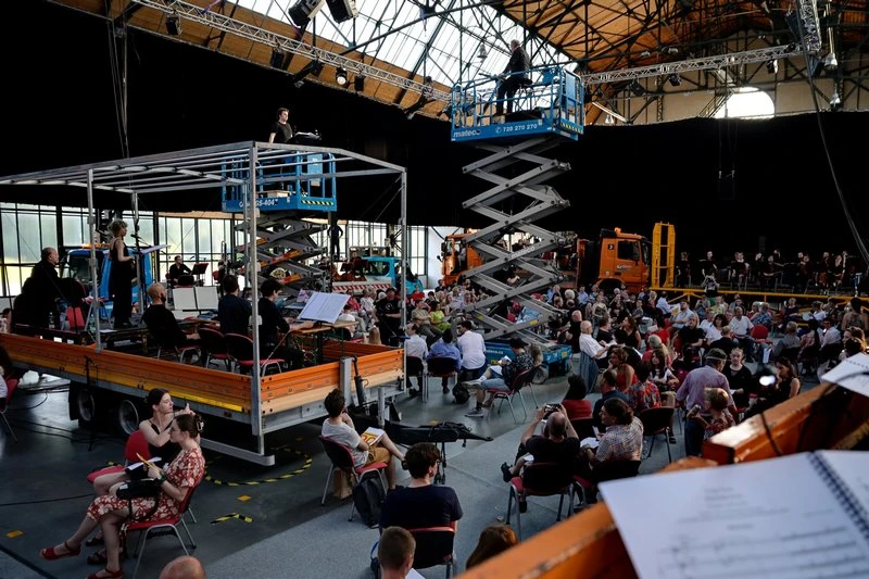 Impozantní scénická realizace Jiřího Nekvasila a Davida Baziky do prostoru Trojhalí umístila nákladní auta, kamiony a vysokozdvižné plošiny jako pódia pro interprety. Posluchači pak byli rozesazeni volně v prostoru uprostřed dění. Toto rozsáhlé dílo si také vyžaduje dvou dirigentů – ti jsou zde umístěni na dvou plošinách. Jiří Rožeň tak diriguje doslova na všechny strany, Petr Kotík naproti němu pak má na starosti dílčí sekci sólových hudebníků – mezi oběma dirigenty pak probíhá pečlivá bezeslovná komunikace, synchronizace nástupů a souhra do jisté míry mimoběžných rytmických pásem. Obsazení sestává ze čtyř orchestrů (hráči ONO – Ostrava New Orchestra a Ostravské bandy), sborů se sólisty (Canticum Ostrava a sólisté Jen Wu, Ana Caseiro, Justina Vaitkutė, Padraic Costello, Felix Heuser a Martin Gyimesi), oddělené žesťové sekce, perkusistů, dvojice narátorů (Nicol Pambieri, Sergio Basile) a týmu zvukařů starajících se o live elektroniku (GRAIM Studio, Luca Richelli, Lorenzo Paglieli a Nicola di Paolo). Mimořádně náročného úkolu uřídit všechny dílčí sekce tohoto hudebního masivu se zejména Jiří Rožeň zhostil s neuvěřitelným nasazením a zjevně maximálním soustředěním, díky němuž si nad partiturou zachoval kontrolu prakticky přes všechna její úskalí.