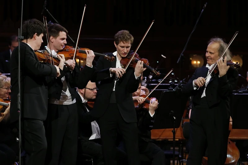 Tak lze nazvat skvělý hudební zážitek, který 30. března 2015 vychutnali posluchači v pražské Smetanově síni Obecního domu. V rámci cyklu Nové horizonty pořádaného Symfonickým orchestrem Českého rozhlasu se spojili čtyři špičkoví čeští houslisté Václav Hudeček, Josef Špaček, Jan Mráček a Petr Matěják k úchvatnému ohňostroji houslového umění. Tři o generaci mladší umělci mají s Václavem Hudečkem společné nejen to, že se účastnili kursů jeho akademie v Luhačovicích a získali tam nejvyšší ocenění. Každý z nich představuje podobně slibný začátek, jakým kdysi oslnil on sám. Koncert natáčely jak Český rozhlas, tak Česká televize. Dramaturgie koncertu se nesla v duchu velké show, což v tomto případě neobvyklost a účinek celého představení velmi umocnilo. K tomu přispěly i vtipné komentáře Jana Pokorného a Václava Hudečka v začátku a mezi jednotlivými čísly pořadu. Koncert zahájil Symfonický orchestr ČR pod vedením Tomáše Braunera půvabně odlehčenou předehrou Rossiniho opery Hedvábný žebřík. Orchestr byl ve skvělé formě a ihned zaujal svou chutí a radostí ze hry. Sólisty pak doprovázel velmi vnímavě a citlivě i v agogicky či dynamicky choulostivých místech. Jako první vznítila houslový ohňostroj jiskra ze smyčce Jana Mráčka v brilantním provedení Introdukce a Ronda capricciosa C. Saint-Saënse. Nechce se věřit, že ten barevný krásný zvuk v Introdukci houslista vykouzlil z obyčejné „fabriky“. Virtuózní závěr Ronda téměř dosáhl nadzvukové rychlosti, ale přesto byl precizně zřetelný a přesný v každé své nanosekundě.