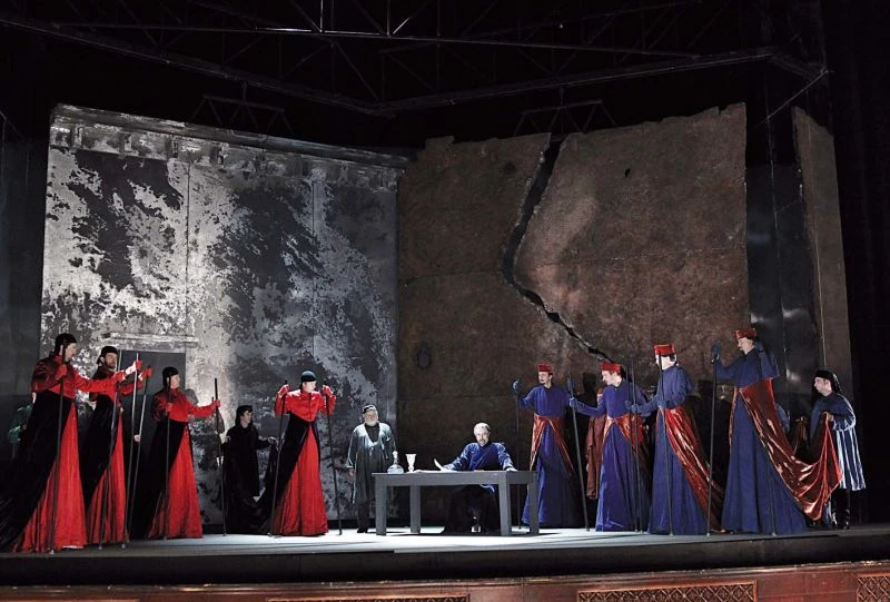 Simone Boccanegra je historická operní freska a udělat ji v nápaditě jednoduché a funkční scéně Ralpha Koltaie takřka historickým minimalistickým režijním rukopisem by mohla být radost, kdybychom měli k dispozici odpovídající obsazení a věnovali bychom premiéře veškeré tvůrčí úsilí. Za režiséra Davida Pountneyho však inscenaci připravil jeho spolupracovník Robin Tebbutt (Pountney přijel až na závěrečné zkoušky) a obsazení bylo šito horkou jehlou (čípak horká jehla to asi konkrétně byla?). Pro tuto operu, jak názorně předvedly obě premiéry, nemáme v Národním divadle odpovídající sólisty – proč ji tedy uvádíme? Teď už asi jen proto, že musíme dodržet smlouvu, kterou uzavřeli naši předchůdci.