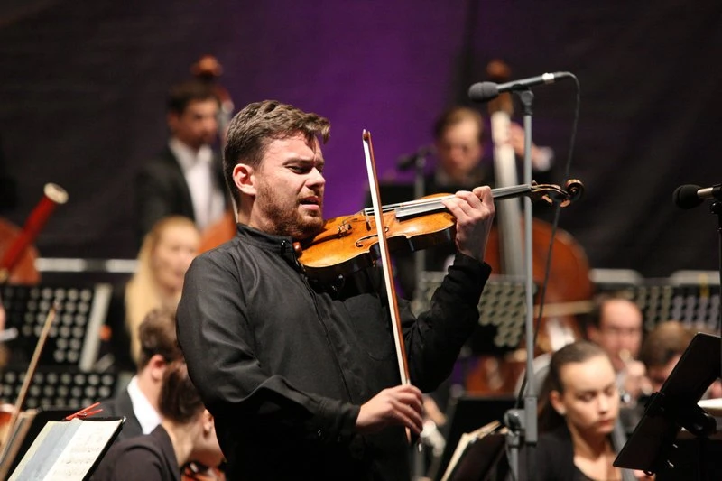 Houslista Jiří Vodička byl prý záskokem za kolegu Josefa Špačka, jenž je čerstvým otcem, ale bylo to znát jen v tom, že jeho paměť měla oporu v tabletu. Vodičkovo pojetí Dvořáka bylo koncepčně nepřekvapivé a Dvořáka (naštěstí) jen pokorně umocňoval a neznásilňoval. Zvláště se mi líbila volná věta. Některé tóny se nepovedly, jak by si sólista určitě přál, jenže má jednu zásadní omluvu, čímž se dostávám k negativnímu rámci večera. Byl to totiž open air koncert. Víra GASKu a krajských úředníků v počasí byla překvapivě pevná, pro mě nepochopitelná. Hazard s počasím vyšel aspoň v tom, že na přibližně 200 diváků nepršelo, vlezlý chlad podzimní noci však nezmizel. (Hodné obdivu byly krátké rukávky Olgy Šroubkové, kterou asi na pódiu hřály reflektory a mládí.) S nápadem provozovat na konci září v Čechách oper air koncert jsem se dosud nesetkal. (Škoda, že se volby nekonaly už v srpnu.☺) GASK se tedy do našich dějin zapíše jak konáním prvního koncertu skvělého mladého orchestru, tak i termínem. Z tohoto negativa vyplynul další – necitlivé umělé přizvučení, na něž doplatil hlavně Jiří Vodička, ale pánové Mendelssohn a Rossini také nezůstali bez zvukové újmy. Snad se někdy dočkám koncertu mládežnického orchestru v akusticky normálním prostředí!