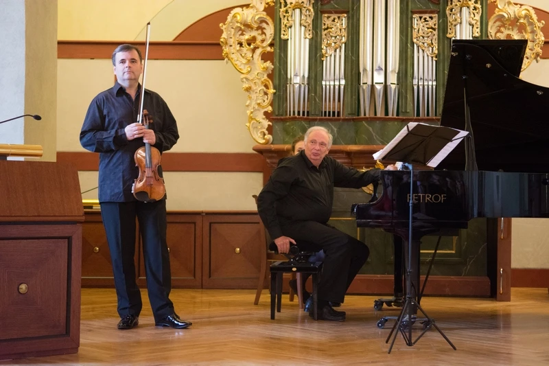 Pražská Matematicko-fyzikální fakulta Univerzity Karlovy pořádá pro fakultní veřejnost a své přátele v barokním refektáři cyklus koncertů, jejichž kvalita i obsah se vyrovnají nárokům nejzmlsanějších pódií. 2. června zde s krásným a brilantně provedeným recitálovým programem zazářili houslista Leoš Čepický a klavírista Ivan Klánský. Oba pánové patří ke špičce našich interpretů, stejně jako jejich světově proslulé komorní soubory (Wihanovo kvarteto, Guarneri Trio). Oba jsou významnými pedagogy AMU. Úvodní půvabná Vivaldiho Sonáta D dur má v originále název „Sonatina per violino e basso“, takže doprovázející hudebník (cembalista) musel dotvořit part dle generálbasu a zažitých pravidel sám. S vývojem hudby tento způsob zanikl, takže Respighi Sonátu a doprovodný part klavíru upravil do podoby, ve které se hraje dodnes. Zazněla v průzračné čistotě zvuku a mladistvé svěžesti, perlivé šestnáctiny Vivace zněly jako z jednoho nástroje. Na novém klavírním křídle Klánský vykouzlil úžasné a křehké nuance. Čtyřvětá Sonáta pro housle a klavír A dur C. Francka vyzněla jako temně romantické drama, plné vášně a proměnných nálad. Oba rovnocenní sólisté předvedli ukázkový dialog komorní souhry a jednotné představy nejvyšší úrovně. Romance f moll pro housle a klavír A. Dvořáka je autorská úprava její verze s orchestrem. Milostně lyrická melodika Romance se vine v ukolébávajícím vlnění a má jen několik dramatičtějších vznětů, takže je velmi těžké udržet tah a oblouk skladby ve stále působivém celku. Navíc, klavírní verze je ochuzena o obohacující barvy orchestrální instrumentace. Provedení Čepického a Klánského však neodolatelně sugestivním způsobem nastolilo atmosféru ztajeného dechu a hlubokého citu. Smetanova Dvě dua pro housle a klavír „Z domoviny“ jsou houslisty ohrávána již od jejich žákovských vystoupení, takže mnohým zevšední a ztratí své skryté barvy a kouzlo. Navíc, klavírní part je znatelně náročnější houslového, což je úskalí mnohých provedení. Klánský je velmistr klavírního zvuku, někdy mám dojem, že jeho každý prst je samostatným nezávislým hráčem, jenž s ostatními citlivě vytváří zvukové barvy. Čepický je jeden z nejskvělejších kvartetních primáriů, což společně vytvořilo málokdy slyšenou podobu z mlhy všednosti náhle vystoupivšího geniálního díla. Ohnivě temperamentní a virtuózní provedení Dvořákovy Mazurky op. 49 přimělo i akademicky noblesní publikum k nadšenému vyžádání další sklenky Dvořákovy živé vody – tanečně rozpustilého Scherza z jeho Sonatiny op. 100.