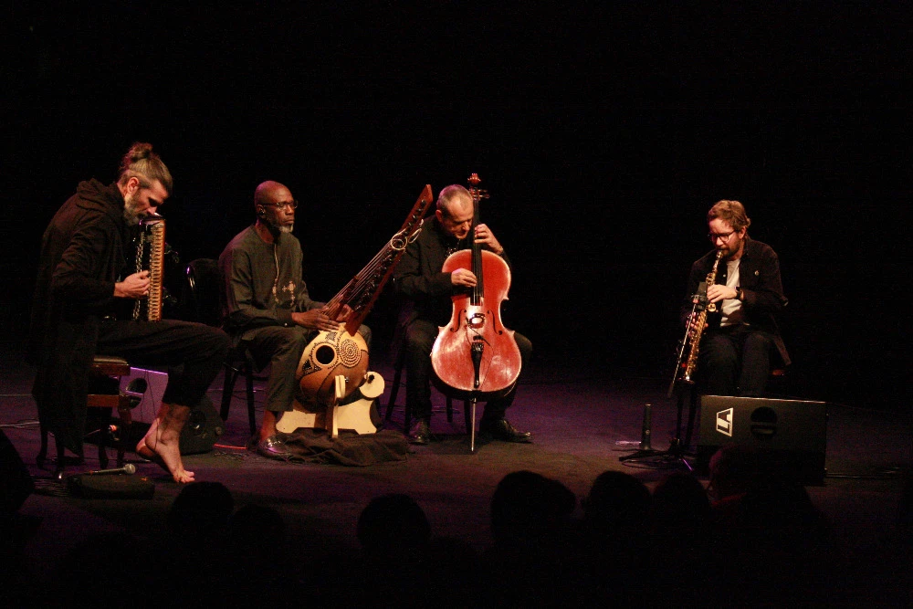 Jinými slovy, nehrálo se na žánry ani na přesnou interpretaci kompozic. Cílem byla cesta v souladu a shodě. Hudebníci vědí, že nemusí hrát a „vést“ pořád všichni. Ač repertoár byl už autorsky „prošlapán“ a nahrán pro album Les Égarés, v pestré dramaturgii vystoupení se přirozeně střídaly sólové pasáže s dialogy, trialogy a tetralogy. Kdykoliv někdo během sólového výstupu narazil na zajímavý motiv, ostatní se po jeho „naposlouchání“ přidávali k „hejnu“ a pomáhali ho rozvíjet. Například Peiraniho lehce balkánsky působící melodie Izao se vyhoupla až z delší z hypnotické, kontemplativní pasáže, kdy nad violoncellovým drónem neposedně improvizoval Sissoko na koru. A motiv nahozený Peiraniho akordeonem se nečekaně rozletěl novými směry ve variacích Parisienova sopránového saxofonu a impromptu „proplétačce“ všech nástrojů.