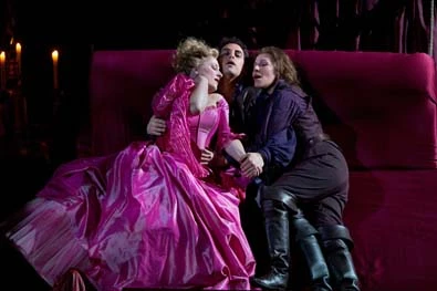 Vtipná virtuózní čísla z Cesty do Remeše, která vyžadují naprosto brilantní souhru nástrojů orchestru, sólistů, sboristů oživila Oryho zjevně a velmi příjemně. Dirigent Maurizio Benini a všichni zúčastnění sólisté byli famózní – Juan Diego Flórez jako Hrabě Ory předvedl svou zatím patrně vrcholnou sebeironizující herecko-pěveckou kreaci v převlecích za poustevníka a za jeptišku, při níž jej režisér nešetřil ani v pohybových eskapádách. Podobně dokonalá pěvecky i herecky byla Joyce DiDonato v kalhotkové roli hraběcího pážete Isoliera, již ztělesnila s neobyčejným šarmem a s pohybovou dokonalostí. Diana Damrau v roli nedobytné hraběnky Adele byla přesvědčivá právě tak. Jen škoda, že její postava měla rysy zcela povrchní „hloupé blondýny“, takže závěrečný happy end s veselým „vítězstvím věrné lásky“ se jaksi nekonal. Putující svůdník v podání Juana Diega byl natolik kouzelný, že virtuózní postelové trio Ory-Adele-Isolier vyznělo spíš jako rozkošná hříčka než jako záměrná hra s prostopášníkem, kterého chceme potrestat. Ale ovšem i tak lze.