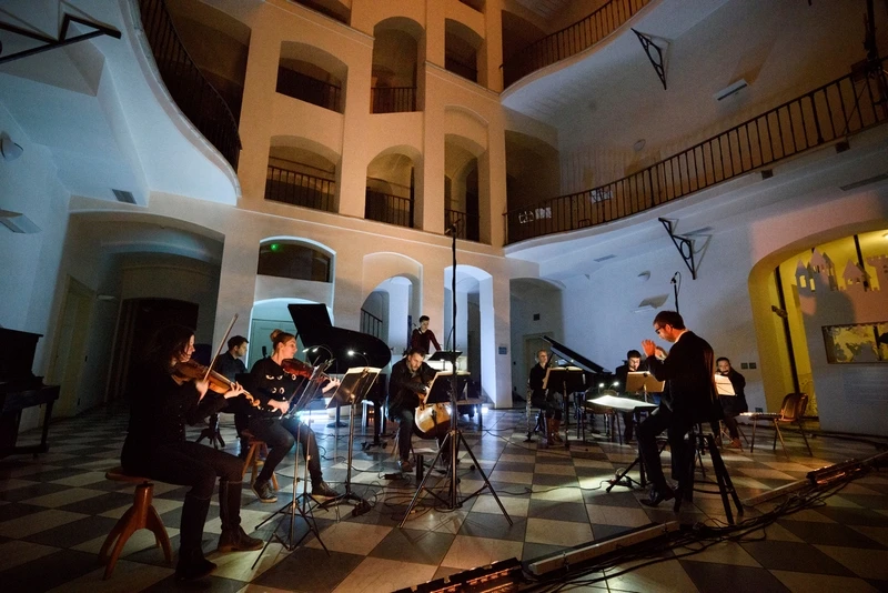 Tři z dvojic kánonů jsou relativně klidné, dvě jsou trochu živější. Již v úvodní dvojici mě okouzlila křišťálová čistota a intimnost. Třetí, nejpomalejší dvojice s předpisem Sehr langsam, schleppend und mit Trübsinn (Velmi pomalu, vléct se, s melancholií) přenesla posluchače do zcela jiného časoprostoru. Poslední dvojice, kterou zahrál soubor přesně podle pokynů autora až dětsky jednoduše a s odzbrojující přirozeností se ještě i po doznění chvěla někde ve vzduchu. Právě během posledních kánonů začal seshora padat „sníh“ – na můj vkus snad už trochu popisné, ale v podstatě milé gesto. Sudé dvojice kánonů jsou o něco temperamentnější. Kánony 2a a 2b zněly lehce a hravě, bez zbytečných afektů. Čtvrtá dvojice, která má v předpisu i slůvko „nervózně“, byla spíše vnitřně neklidná než vyloženě výbušná a brilantní pasáže ji dodávaly až fantazijní charakter. Ačkoliv byl light design dobře padnoucím dotvořením atmosféry, většinu času jsem se líp cítila se zavřenýma očima. Pojetí Orchestru Berg bylo totiž sice trochu odosobněné, o to líp si však do něj každý posluchač mohl promítnout své myšlenky, ponořit se do něj a stát se součástí plynoucího celku.