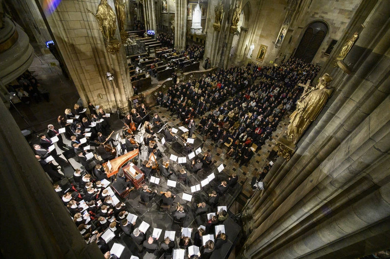 Dílo, jež napsal Lully u příležitosti křtu svého prvorozeného syna, vystřídala poté Biberova opulentní hostina pro 53 hlasů, komponovaná pravděpodobně v roce 1682 pro oslavy 1100. výročí založení salcburského arciopatství svatého Petra. Skladba byla napsána na míru salcburskému dómu pro dva osmihlasé sbory stojící proti sobě v chóru, čtyři instrumentální skupiny hrající ze čtyř kůrů, čtrnáct sólistů a čtvery varhany. Collegium 1704 realizovalo před dvěma lety mimořádně zdařilou rekonstrukci Biberovy mše přímo v honosném prostoru salcburské katedrály sv. Ruperta a Virgila, jež se nepochybně stala jedním z nezapomenutelných zážitků v historii Salcburského festivalu. Přestože Václav Luks tehdy v rozhovoru pro ČT řekl, že je Biberova mše úzce spjata s prostorem, pro který byla napsána, což je něco, „co si doma nenasimulujeme,“ rozhodl se ji přenést do prostor architektonicky a také akusticky zcela odlišných. Projevila se přitom nejen jeho schopnost čelit velkým výzvám, ale také značná hudební představivost, fantazie a pochopitelně zkušenost. Hráče na zobcové flétny a dva trumpetisty vyslal dirigent vzhůru na protilehlé ochozy, další trumpetisty na Wohlmutovu kruchtu a pěvečtí sólisté se museli z provozovacích důvodů přesunout za instrumentalisty. Oba sbory včetně sólistů stály tedy na jednom pódiu.