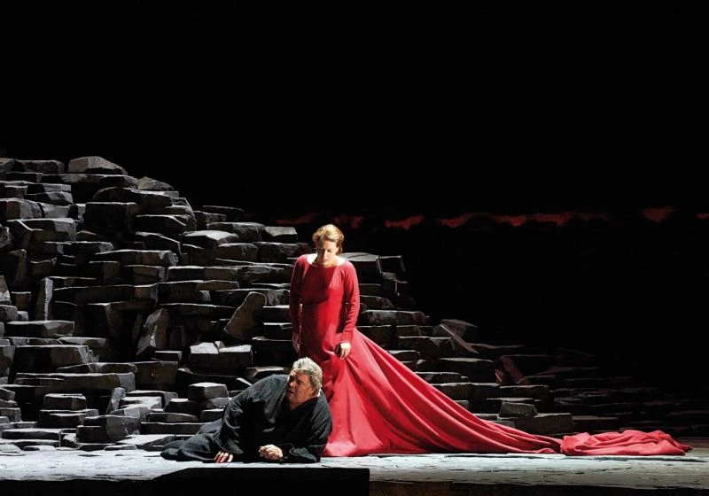 Program počátku nové sezony Vídeňské státní opery je ještě úzce spojen s nedávným repertoárovým obohacením inscenace vrcholného díla německého romantického skladatele Richarda Wagnera, jehož jubilejní 200. výročí narození a 130. výročí úmrtí si připomíná letos celý hudební svět. V rakouské metropoli se konala 13. června 2013 premiéra jeho nejvýznamnější opery Tristan a Isolda . Velkolepé hudebně-dramatické dílo o třech dějstvích hudebně nastudoval dirigent Franz Welser-Möst , který z postu generálního hudebního ředitele Vídeňské státní opery vstupuje v září již do své čtvrté sezony. K hostování byl přizván britský režisér David McVicar působící na předních scénách, dokonce i v Královské opeře Covent Garden v Londýně nebo newyorské MET, ve Vídeňské státní opeře debutoval. Wagnerovo libreto vychází z námětu středověkého dvorského eposu původní keltské legendy s milostným příběhem. Často bývá spojováno s předlohou díla Tristan Gottfrieda von Straßburga, jenž upravil legendu Tristan und Iseult, jejíž nejstarší písemná verze pochází z 12. století. V opeře se ovšem výrazně promítá Wagnerova láska k Mathildě Wesendock, jeho záliba ve středověké literatuře a zabývání se dílem Arthura Schopenhauera, významného německého filosofa 19. století. Premiéra zazněla v Mnichově roku 1865 pod taktovkou Hanse von Bülowa a stala se přelomovým dílem nejen ve Wagnerově tvorbě, ale ovlivnila mnoho skladatelových následovníků. David McVicar hudební drama oprostil od nánosů popisnosti a společně se scénografem Robertem Jonesem vsadil na abstrakci scény a jevištní řešení umocňující jak nadčasovost mýtického příběhu, tak znění a provedení hudby. Jonesova výprava akcentuje jen nejnutnější objekty děje a dekorace pro ně volí scénograf monstrózní adekvátně k rozsahu díla, které otevírá do širokého časoprostoru. Lokalitu pobřežního místa připomíná v jednotlivých dějstvích vrak lodi, temné kašírované kamenné pozadí i podlaha, tmavý kmen stromu, nad nímž září drátěný věnec. Jednání postav konfrontuje režisér s paralelou proměnlivých barev velkého scénického Měsíce, jenž je účelově vnímán i jako Slunce. V jevištní metafoře přírody a pozemského milostného dramatu Tristana a Isoldy vnesl David McVicar na scénu zrcadlo atmosféry podobných nálad, které podpořil Robert Jones ještě změnou kostýmních barev. V nočních výjevech mají oba milenci černé kostýmy se třpytkami, v okamžicích vášně nosí Isolda disponující léčitelskými a magickými schopnostmi červené dlouhé šaty a Tristan je emočně sevřen v tajemném smutném černém obleku. Modré nebe se pojí s klidným děním a smírem postav a šeď Měsíce se snoubí se stavy neklidu a vnitřních svárů. Decentní světelné efekty podpořily poetiku situací (světla Paule Constable ). Příběh legendy o nenaplněné lásce, nenávisti, touze a zradě rozehrál McVicar s Jonesem ve velkých obrazech umocňujících silné emoční stavy.