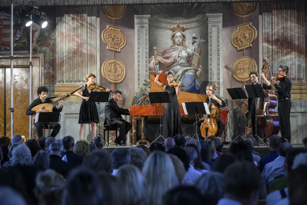 Od prvních momentů strhnul na sebe pozornost především cembalista Stefano Demicheli a to zejména naprosto neortodoxním koncertním chováním, které má daleko od obecně sdílených představ o „vážné hudbě“. V takhle malém obsazení, kde obvykle muzikanti vedou sami sebe navzájem, často vstával od cembala, dirigoval rozmáchlým gestem ostatní, i při hraní často vstával a sedal si s těžkou dobou, aby podpořil afekt, který hudba právě přinášela. Hned u první skladby se ptáte, proč to vlastně dělá, vždyť jeho kolegové jsou svrchovaní muzikanti, kteří vedení nepotřebují a vzhledem k tomu, že byl v podstatě za jejich zády, mohli ho vidět stěží, nebo jen periferně. Ale odpověď mi připadala zřejmá; Stefano Demicheli patří mezi muzikanty, kteří jsou hudbou prostoupeni skrz naskrz a prostě nemohou jinak. Stal se bohémem, jehož múza ovládla a vláčí s sebou světem klikatých barokních pěšinek i širokých silnic, jeho teatrálnost pochází z jižního temperamentu, vášně a lásky k hudbě. Teprve ve třetí skladbě, čtyřech tancích od Nicoli Matheise pro housle, na sebe pozornost strhla první houslistka, Margherita Pupulin. Její fenomenální provedení virtuózní partitury patřilo mezi vrcholy večera, a místy se zdálo, že do jejích houslí vstoupil duch legendárních italských houslistů 18. století. Celkovým vrcholem večera byla pro mě první skladba po přestávce, Duranteho concerto f moll. Melancholicky lkavá první část se magicky nesla prostorem a všichni umělci na pódiu ukázali jednotu v pochopení hloubky a charakteru díla.