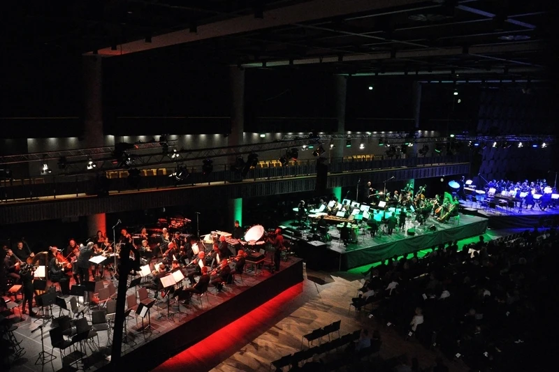 Prvním drobným pozitivem večera bylo zjištění, že v programu jsou uvedeny časy jednotlivých skladeb. Zvlášť u soudobé hudby, jejíž autoři jsou schopni se rozmáchnout k neobvyklým délkám, je tak nějak uklidňující vědět, na jak dlouhý kus se vnitřně připravit. O něco méně příjemné bylo odhalení, že v protáhlém sále nebylo možné tři pódia rozmístit kolem publika a že dva postranní orchestry byly proti prostřednímu jen lehce posunuté. Prostorový účinek tím byl pochopitelně limitován, ale ve výsledku se ukázalo, že ne tak výrazně, jak jsem se zpočátku obával.