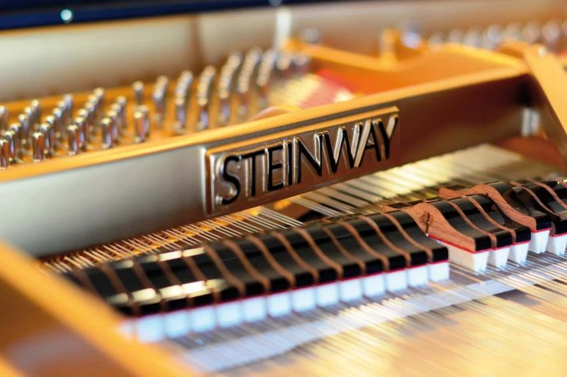 Během ní máme možnost nahlédnout do výrobního provozu. Vstupujeme do prostoru, který voní dřevem a laky, všude je německy čisto, úpravno. Dláta, hoblíky a šroubováky pečlivě „zaparkované“ v příslušných otvorech na pracovních stolech. Po obvodu velkého prostoru členěného jen masivními sloupy, deponiemi materiálu a torzy budoucích klavírů brousí a hoblují mladíci lehce přes dvacet. Jsme však ujištěni, že továrna zaměstnává i staré fachmany, z nichž mnozí tu pracují třeba i padesát let. Dvanáct tisíc součástek skládají řemeslníci dohromady bez náznaku jakékoli pásové výroby. Hana Kasman vyčísluje podíl ruční práce na 80 %. „Kvalita nástrojů stojí na třech kritériích. Materiál, konstrukce a způsob výroby. Při získávání materiálu na světových trzích absolutně nehledíme na náklady. Pokud jde o konstrukci, opíráme se o více než sto patentů firmy Steinway, která je de facto zakladatelem moderní podoby klavírů. Dříve se používalo výhradně paralelní ostrunění nástrojů. Klavír byl – jednoduše řečeno – čtverhranný stůl. Pan Steinwey však přišel s ideou zkřížit struny, což přináší plnější tón a klavíru to dává jeho typické, pravostranné vykrojení. Během výroby každého jednoho klavíru evidujeme všechny kroky, které učinili jednotliví řemeslníci. Datum, úkon, podpis. Kdyby ten předchozí neodvedl dokonalou práci, ten následující by práci přerušil. Díky tomu jsou naši lidé zvyklí pracovat maximálně přesně.“ Jak se ukazuje, soulad klavíru a hráče je kýžený bod, k němuž se oba musejí těžce propracovat. Klavírista léta cvičí, dře, studuje. Nástroj dva roky čeká na své dokonale vyschlé dřevo a pak celý rok trpělivě snáší dláta, brusný papír či vrstvení dřev, mezi nimiž nechybí mahagon. Chce-li mezi elitu, musí si to tvrdě zasloužit. V oddělení, kde se budoucímu klavíru vdechují jeho zvukové vlastnosti, se pracuje s mnoha materiály – dřevo, kůže, filc – a ty jsou v koncertním nebo nahrávacím provozu nesmírně namáhány. Naše průvodkyně ukazuje na dveře jakési garáže se silnými vraty, zpoza nichž je slyšet nářek – tedy kdyby koncertní křídlo mohlo naříkat, znělo by to jistě právě takhle. Jako by tam někdo zběsile jezdil po klaviatuře zleva doprava a zase zpátky. Snad šílený maniak nebo neúspěšný interpret v touze pomstít se. Jde ale o regulérní součást procesu zrodu každého nástroje. Musí být totiž připraven na fyzickou zátěž až 20 tun, na neustálý – byť očím neznatelný – pohyb a kvůli tomu je nutné vědět, že materiál v nejnevhodnější chvíli nepovolí. Budoucí klenot některého koncertního sálu nebo studia je tedy na celou jednu hodinu uzavřen na tuto samotku, jejíž stěny jsou vystlány akustickým obkladem, aby hlasitá procedura nepřivedla okolní pracovníky továrny Steinwey k šílenství svým monotónním přehráváním škál ve vysokém tempu. Připomíná to trochu zvonkohru s válcem, který svými přesně usazenými výstupky rozechvívá kovové planžety. Zdejší „stroj na údery“ dělá něco podobného. Klavír se přistaví tak blízko, aby ostny válce obsáhly celou šířku hracího stolu, a pak už se prostor rychle vyklidí, neboť ten nářek se opravdu dlouho vydržet nedá. Každá jedna klávesa totiž dostane během této hodiny pravdy až 10 000 úderů.