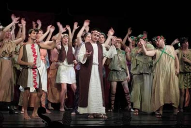 Vedle sólistů je hlavním aktérem inscenace početný sbor složený mimo jiné ze členů Dětské opery Olomouc, kterou pedagogicky vedete. Kdy a proč byl soubor založen a jak probíhá výuka? Podstatnou část sboru nakonec tvořili studenti Hejčínského gymnázia, který vede Lenka Mlynářová-Dohnalová. Vedle nich se tam představili také členové jejího dospělého sboru při katedře hudební výchovy Pedagogické fakulty Univerzity Palackého. Tento dvojsbor doplňovali starší děti právě z Dětské opery Olomouc, která pracuje pod mým vedením při Slovanském gymnáziu Olomouc. Dětská opera Olomouc vznikla zcela náhodně. Jeden rok jsem suploval v hodinách hudební výchovy v nižších třídách gymnázia a kladl si otázku, co má dnes smysl s dětmi dělat, a jak je k něčemu motivovat. Nakonec se mi nejvíc osvědčil starý barokní recept se školním divadlem. Napsal jsem krátké zpívané scénky na náměty z historie Olomouce, ve kterých jsem nenápadně a jednoduše použil a zapracoval vše, co jsem jim chtěl v teorii vysvětlovat (sonátová forma, rondo, recitativ, kánon, gregoriánský chorál, menuet, akordy, organologii atd.). Pak se to celé pospojovalo do hodinového celku a vznikly tak naše Tvarůžkové ódy . Aby se jednotlivé scénky dětem dobře herecky zvládaly, použil jsem známé historické reálie, jen jsem je oblékl do současného kabátu – z Břetislava svádějícího Jitku se stal karatista, Václav III. byl zavražděn při ragbyovém zápase, Mozart a jeho otec Leopold se utkali jako dva boxeři atd. Běžným způsobem výuky bych nikdy nevysvětlil tolik teorie, která je bez praxe příliš abstraktní. Za tohle jsem formě opery obzvlášť vděčný.
