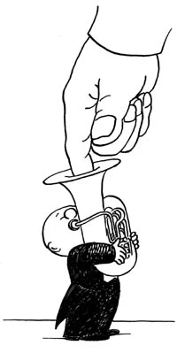 Kresba by však mohla znamenat i něco jiného. Situaci hudebního profesionála, kterému osud nějak zabrání pokračovat v umělecké dráze. Houslista si uřízne prst na levé ruce, pěvec přijde o hlas, dechař dostane plicní alergii. Kolik takových případů se stalo! Jsou to skutečné tragédie lidí, kteří celý svůj život zasvětili hudbě a žádná zadní vrátka si nenechali otevřená. Přesto jsem ještě neslyšel o případu, že by se umělec zhroutil, že by nebyl s to pokračovat v normálním životě. Prakticky všichni takto postižení hudebníci rychle nalezli uplatnění, zejména v oblasti organizační. Stali se z nich skvělí inspicienti divadel, hudební badatelé a archiváři, rozhlasáci či manažeři. Hudba dokáže člověka osudově připoutat, ale nezaslepí ho. Kdo se vyzná ve virtuálním světě hudby, zvládne i svět skutečný.