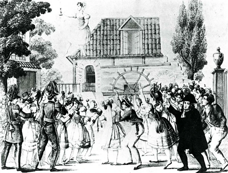 Do vynálezu fotografie jsou kresby a litografie jediným zdrojem informací o dobovém baletním stylu, o němž si dnes díky efemérní přirozenosti choreografie můžeme jen číst. Balet Náměsíčná přišel na scénu Stavovského divadla z Pařížské opery, kde ho v roce 1827 vytvořil choreograf Jean Aumer na hudbu Ferdinanda Hérolda a libreto Eugéne Scriba. Bouřlivé ovace obecenstva získávala Julie Springrová v hlavní roli Terezy, když se svíčkou v ruce, s jednou nohou bosou a druhou obutou, kráčela po střeše domu vstříc k bledému svitu měsíce.