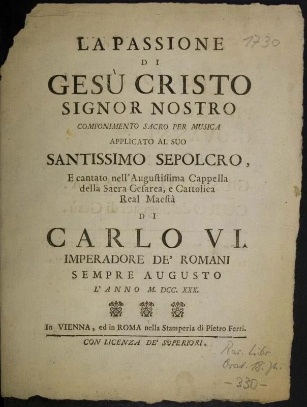 Roku 1730 napsal vídeňský císařský dvorní básník Pietro Metastasio (1698–1782) libreto k oratoriu La Passione di Nostro Signore Gesù Cristo, které téhož roku zhudebnil Antonio Caldara. Metastasiovo libreto se rychle stalo klasickým, dočkalo se (stejně jako šest dalších jeho oratorních libret) desítek zhudebnění a těšilo se zájmu skladatelů až do začátku 19. století. Přestože Metastasio navazuje v La Passione na zmiňovanou tradici sepolcro-oratorií, je jeho básnický jazyk v mnoha ohledech nový. Básnické obrazy vykreslují ve vyprávění ústy Josefa Arimatejského utrpení Ježíše Krista s drastickou až dokumentární syrovostí, jakou nenajdeme ani v textu evangelií. Taková retrospektivní líčení jednajících postav, v nichž na první pohled upoutá bohatost básnického jazyka a osobní až intimní pohled vypravěče, jsou typickým znakem Metastasiových textů, v nichž nejsou krvavé události ukřižování předmětem výpovědi básníka, ale jsou zprostředkovány postavami, které autor umístil do centra děje. Metastasio tak ctí i ve svých oratorních libretech základní východisko aristotelovské poetiky zdůrazňující důležitost jednoty času a místa děje se zachováním jedné dějové linky.