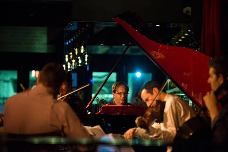 Jak probíhalo zkoušení se samotným autorem? Přeci jen vás většinu času dělí oceán. Když pominu to, že David píše stále nové a nové verze, tak při samotném zkoušení žádný problém není. Vždy nám pošle noty s dostatečným časovým předstihem, takže máme možnost připravit se v maximální možné míře a ony improvizační pasáže řešíme až při osobním setkání s Davidem. Jsme již v té fázi spolupráce, že někdy dáváme na stůl připomínky a nápady také my. David, jakožto hloubavý skladatel, naše impulsy vždy promýšlí a často i zakomponuje.