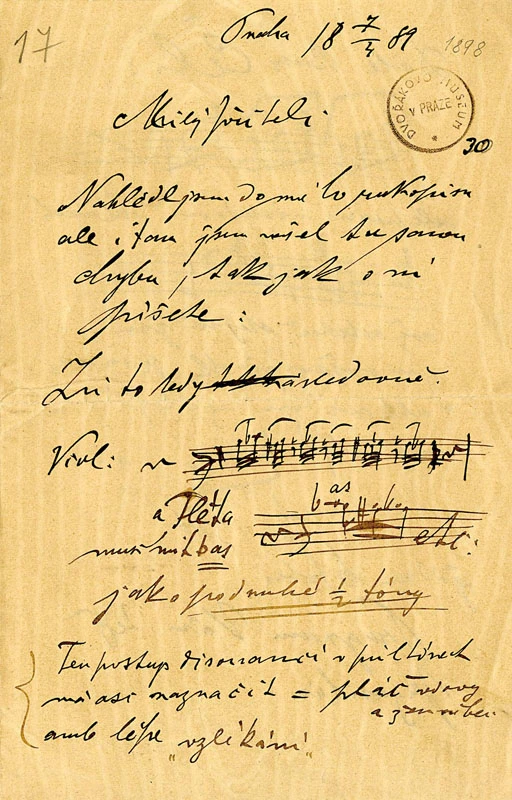 „Milý příteli. Těšilo by mne velice, kdyby Jste mě zde na Vysoké navštívil. Přijeďte ale hned, v sobotu jedu se podívat na staroslavný Worlík, snad by jste mohl se mnou. Ráno jede vlak v 7. h a přijedete do Příbrami ve ¾ na 10 odpoledne v 2 hod. = a přijedete v 5 ¼ hod. večer. Z Příbrami pak by jste čekal na poštu a jede hnedle dále k Rožmitálu. Vy by jste ale v Bohutíně slezl a já bych na vás čekal, pak už máme jen ½ hod. na Vysokou. Jízda poštou trvá asi něco přes hodinu. Tedy přijeďte třeba ve čtvrtek odpoledne aneb v pátek ranním vlakem. Naproti přijdu vždy. Dvořák.“