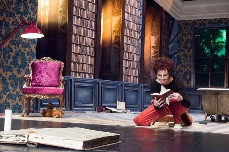 Knihami obestavěný Vypravěč v podání Tadeáše Hozy si krátí bouřlivou noc čtením oblíbených pohádek. A pro tu dnešní plískanici si vybral příběh o mazaném kocourovi, který se rozhodl přelstít nejen obra kouzelníka, ale i francouzského krále. Od samého počátku je zřejmé, že režie Marka Mokoše záměrně balancuje na hraně tradiční líbivé pohádky, a přitom zůstává věrna estetickým ideálům moderního brněnského divadla. Výsledné pojetí je takřka snové – na pódiu figurují tradiční pohádkové prvky, ale nad vším jakoby se vznášela bizarní a groteskní aura. Tento dojem umocňuje také scéna sama – potemnělý dům, blikající zářivky, trůn obra v podobě ruky, hudebníci v kostýmech z 18. století, které je potřeba na začátku představení natáhnout velkým zlatým klíčem – to vše dohromady pomáhá od samého počátku nastolit žádoucí atmosféru. V tomto ohledu si obzvláštní pochvalu zaslouží světelné a zvukové efekty. Ať už se jedná o déšť, hromy a blesky za okny Vypravěčova domu, nebo děsivé zvuky obklopující okolí obrova hradu.