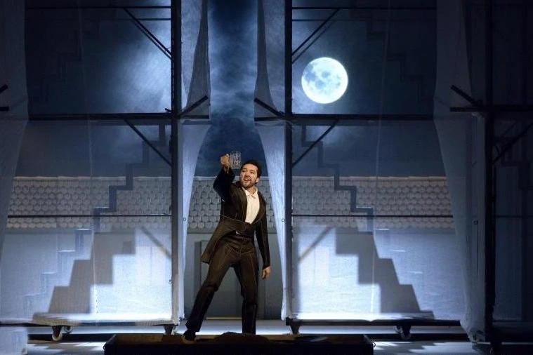 Už scénografie je tvrdý oříšek. Jakub Kopecký umístil do pozadí jeviště poměrně malý portál, za ním nízký domek s prejzovou střechou, dá se jím na scénu vstoupit jen v podřepu, raději podlézt. Za ním je na začátku schován pijácký umělecký vikárkový sbor – jen mu pivní korbele koukají (když je zvednou pořádně nad hlavu). Slyšet je skoro není. Špatně! Před tím falešným portálkem jsou po jeho obou stranách jakási lešení, obalená na počátku a na Měsíci průhlednou bílou textilií. Příliš funkční toto řešení pro operu není – málo se používá a zmenšení prostoru uprostřed jeviště na stísněný interiér nepřináší ve druhé části opery žádnou podstatně novou kvalitu.