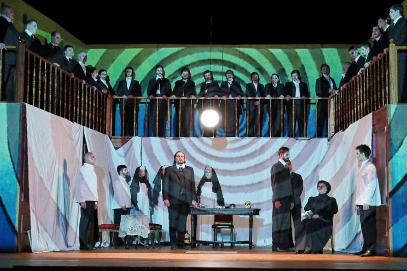 Už předehra poskytla režisérovi možnost, aby ji doprovázel němým černobílým filmem, z něhož nebylo jasné, kdo je kdo, ale viděli jsme muže vstupujícího do ložnice mladé dívky, později téhož muže a mladou dívku s mladíkem – podivný milostný trojúhelník. Otevřela se opona. Mladá dáma (Agáta) je hospitalizována v nemocnici, přicházející mladý muž (Max) se pokusí zastřelit onoho druhého muže se slunečními brýlemi (Agátin otec Kuno, který ji v jejím dětství zneužíval) a je spoután do svěrací kazajky. Řádové sestry strhnou bílá prostěradla ze stěn a jsme v seriózní dřevem obložené pracovně Sigmunda Freuda (scénograf a výtvarník kostýmů David Janošek). Přichází k němu Agáta, aby ji vyšetřil. Má se k panu doktorovi velmi důvěrně, její sexualita je na postupu (on jí zdvořile uhýbá), Max by se asi divil.