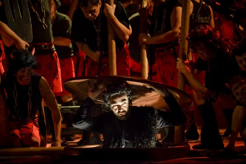 Režisér Jiří Heřman pojal inscenaci jako rodinné představení – a přístupnost pro něj byla zřejmě prioritou. Přitom ale neslevil ničeho na kvalitě zpracování. Jeho režie je plná nápadů, velmi vtipná a využívá asi veškeré technické vymoženosti současného divadla. Scéna (Pavel Svoboda) všech tří dějství je důmyslně a jednoduše propojována a zahrnuje boční výstupy inspirované scénou barokního divadla. Konkrétně scénicky je vytvořeno vlastně pouze první (hospoda) a třetí dějství (zámek), peklo vznikne částečným odkrytím scény prvního dějství. Výrazným přidáním ke klasickému ději je dějový rámec, který tvoří výlet školní skupiny dětí s učitelkou a k němu přidané mluvené dialogy před začátkem opery. Animace pak dotváří příjezd dětí do Mokré Lhoty a návštěva místního zámku. Děti se pak na scéně nachází po celou dobu trvání opery jako pozorovatelé, kteří občas vstupují do děje. Nápadná podoba tohoto rámce s novým nastudováním Orffovy opery Měsíc v pražském Národním divadle (premiéra 20. října 2016) je pak snad čistě náhodná.