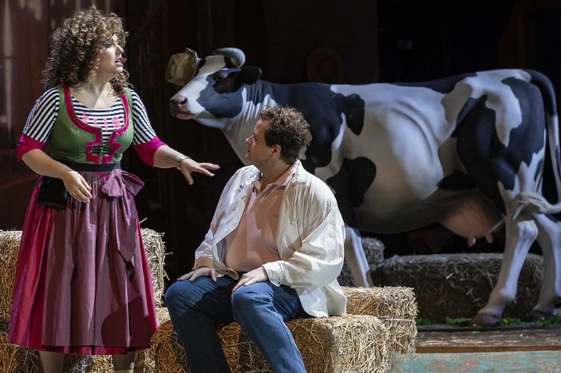 Po pravdě řečeno, donekonečna se opakující retroinscenace vložené do druhé poloviny minulého století mi připadají už poněkud stereotypní. Prodanka s Jeníkem v džínovém oblečku a s Mařenkou v džínových lacláčích – no proč ne, kdyby to bylo k něčemu dobré. Prý jde o osmdesátá, devadesátá léta zřejmě v postkomunistické zemi. Drážďanská Die verkaufte Braut je hraná s jednou pauzou v baru nazvaném Kezals Village. Mařenka je tam servírkou ve stylizovaném lidovém kroji s barevnými teniskami na nohou, Kezal šéfuje v bleděmodrém obleku s černou košilí a žlutými brýlemi, balet v barevných krojích vystupuje na malém barovém jevišti. Paní režisérka Mariame Clément udělala všechno pro to, aby Prodance vytvořila pevné zázemí. Někdy trochu proti logice příběhu pravda, ale jde přece o komedii. Kromě barového koutku na pravé straně proscénia hraje svou nezastupitelnou roli vstup pro barový personál (dveře vlevo) a v pozadí čitelně označené WC pro dámy a pro pány, přičemž mnohá legrace spočívá v tom, že některý pán vstupuje omylem do dámských dveří. Je žádoucí, aby divák sledoval, jak dlouho se ta která postava na toaletě zdrží a s jakou vychází. Na jevišti nechybí uklízečka (bez koštěte a kbelíku není, jak známo, „moderní“ operní režie a zde přibyl i fungující vysavač).