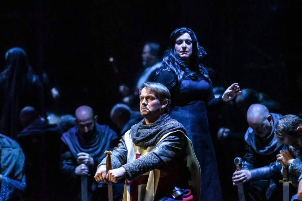 Vrchlického libreto a Dvořákova operní partitura – mimochodem dosud nevydaná tiskem, což z každé inscenace činí dobrodružství a překvapení, protože publikum netuší, po jakých škrtech a úpravách inscenátoři sáhnou – kladou na inscenační tým značné nároky. Zatímco režie Martina Otavy za režijní spolupráce Moniky Hliněnské vycházela vstříc konzervativní části publika a interpretovala operní příběh v tradičních mantinelech zaběhnuté interpretační tradice, scéna a kostýmy Hartmuta Schörghofera neskrývaly ambici posunout inscenaci směrem k dnešnímu divákovi odkojenému fantasy ságami. Zatímco křižáky Schörghofer oblékl do arcikonzervativních divadelních kostýmů, které měly daleko k vizuální působivosti Pasoliniho či Vláčilových středověkých filmů (slušelo to snad jen vojevůdci Bohumírovi a poustevníku Petrovi), Hydraota byste zaměnili za Muammara Kaddáfího a Ismena za postavu z Hvězdných válek. Funkční pohyblivá scéna s odrazovou plochou pro světelný lesk a video design mohla být podle mého názoru využita rozhodně imaginativnějším způsobem, podobně i světelný design Jakuba Sloupa. Stačilo nechat se inspirovat více než třicet let starou bayreuthskou inscenací Nibelungova prstenu Harryho Kupfera a dnes již nenákladná laserová show mohla proměnit závěr II. aktu s únosem Armidy a Rinalda a celý III. akt v nezapomenutelnou podívanou. V tomto ohledu jsem od plzeňské inscenace čekal přece jen více. Za pohybovou spolupráci byl zodpovědný Jiří Pokorný a choreografii soubojů Karel Basák: zatímco bitevní scéna ve IV. aktu rozhodně nepůsobila amatérsky, rozpačitě pobíhajícím sboristům v I. dějství a vlnícím se sboristkám ve III. aktu se plzeňská inscenace přece jen nevyhnula.