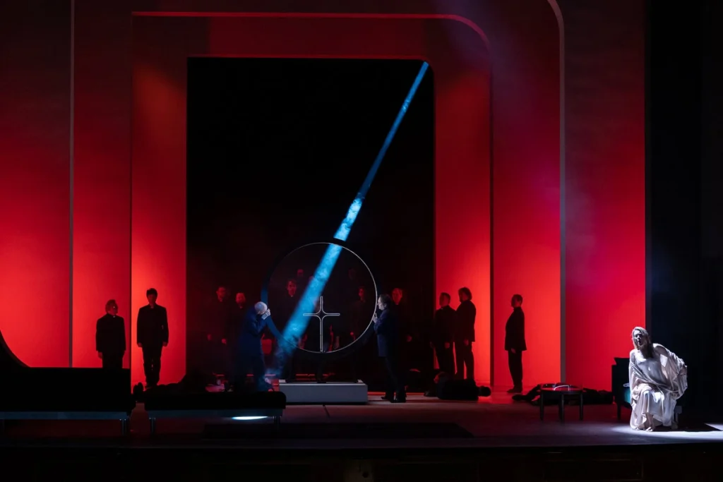Režisérem inscenace je šéf brněnského operního souboru Jiří Heřman. Nepopiratelná je estetická kvalita výtvarné složky (scénografie Dragan Stojčevski), středové postavení výrazného okrouhlého nosiče symbolů, který je společný pro jakoukoli jevištní situaci (gazela, náboženské symboly, štít sv. Michaela), prohlubování i omezování hloubky jeviště, efektní barevné svícení zásadně z jeviště (Daniel Tesař) i za cenu občasné světelné ztlumenosti výjevů. Heřmanovo pojetí zápasu křesťanství s orientálním náboženstvím vyznívá jednoznačně ve prospěch orientálců. Ti jsou také povyšováni a zavěšováni do vyšších sfér – jak Muezin na začátku, tak i Armida, vznášející se vzhůru k nebesům, byť k jejímu křtu z ruky Rinaldovy snad ani nedošlo. Kostýmy Zuzany Rusínové Štefunkové jsem poprvé nepřijala bez výhrad. Mimořádně nadaná, viditelně emotivní autorka kostýmů, zdá se mi, tentokrát nedokázala prosadit svůj vlastní inscenační rukopis. Doplatil na to zejména mužský sbor představující křižácké rytíře. Ti nepůsobili ve svých tmavých košilích s kolárky a v kalhotách téže barvy v žádném případě jako reprezentanti dominantní síly, jak by si byl hluboce věřící skladatel jistě přál. Trošku „hrdinskosti“ jim na chviličku propůjčilo pár náznaků brnění, většinou však (zjevně záměrně) působili jako skupina, která nijak nevzbuzuje kladné pocity publika. Navíc sbor, pokud byl na jevišti, téměř vždy zpíval se zpožděním po dirigentově gestu, zatímco za jevištěm se mu dařilo lépe (sbormistr Lukáš Kozubík). Režisér vyžadoval od sboru drobné malicherné akce, které jim na důstojnosti záměrně ubíraly. Postava kazatele Petra (Štefan Kocán) byla výrazně zkarikována, jeho ležérní světlý oblek, nahrbená, téměř se plížící postava prkenně nesoucí před sebou růženec nebo misku s kadidlem se projevovala zvláště podivným způsobem.
